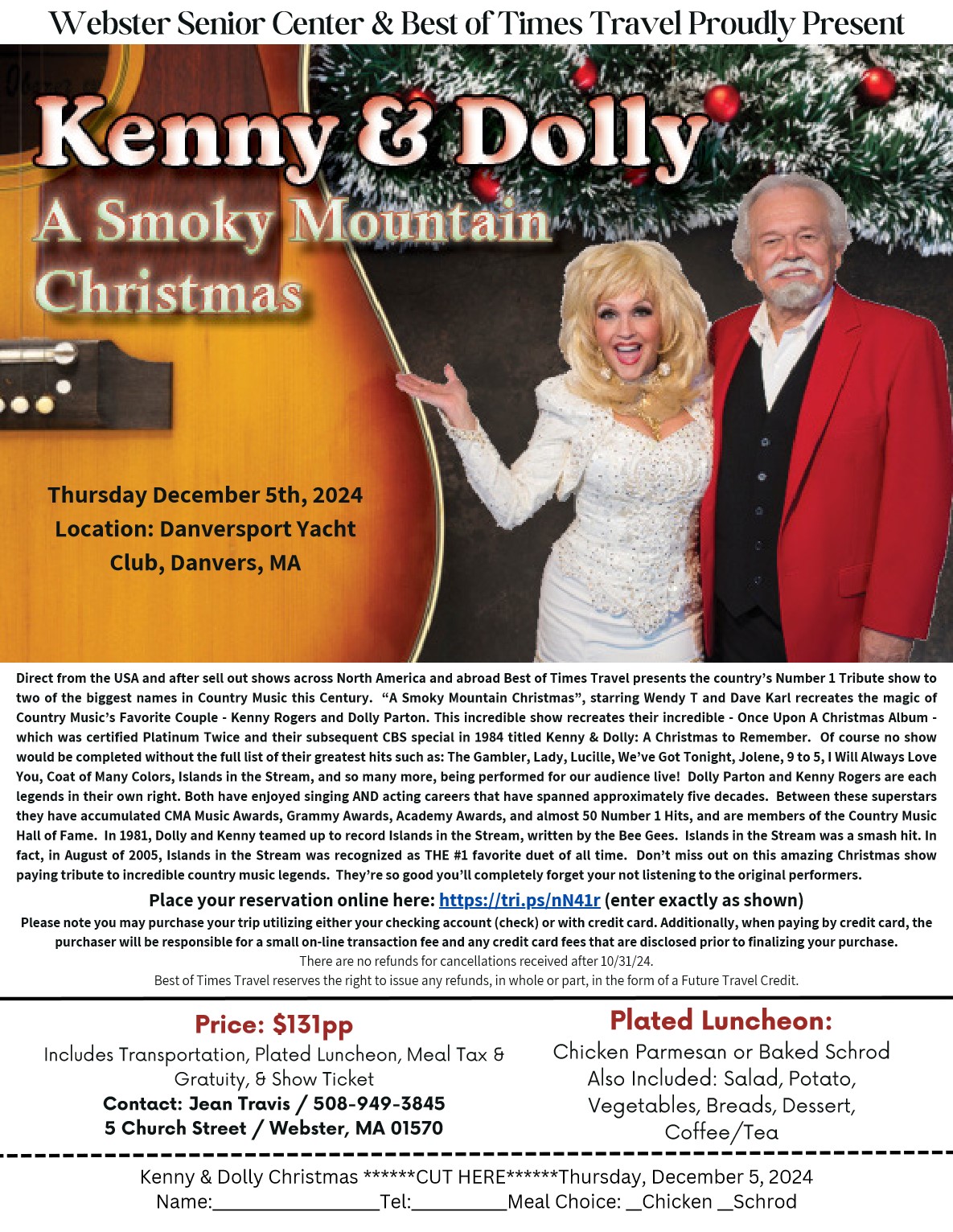 Day trips for BEST OF TIMES include transportation, plated luncheon, meal tax & gratuity, and show ticket. Pick up location for BEST OF TIMES trips will be at Memorial Beach in Webster MA. Below is a list of our currently scheduled trips. If you are interested in signing up for any of these you may either register directly through the link provided on the flyer or stop in the senior center to sign up. Checks, or credit cards are accepted. Payment is due 25 days before the trip.